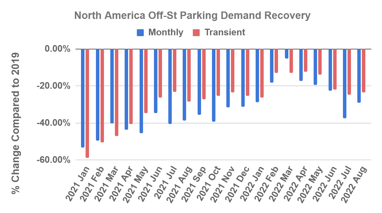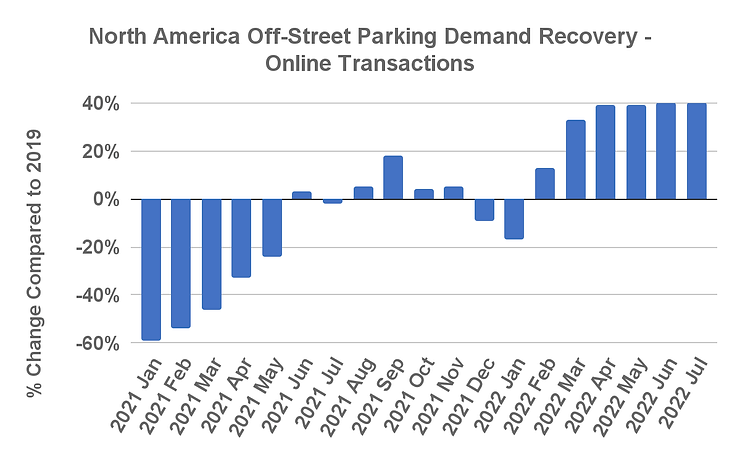 Figure 1: North America Monthly Off-street Parking Transaction Volume Compared to 2019 (Data Source: Smarking Industry Benchmark)