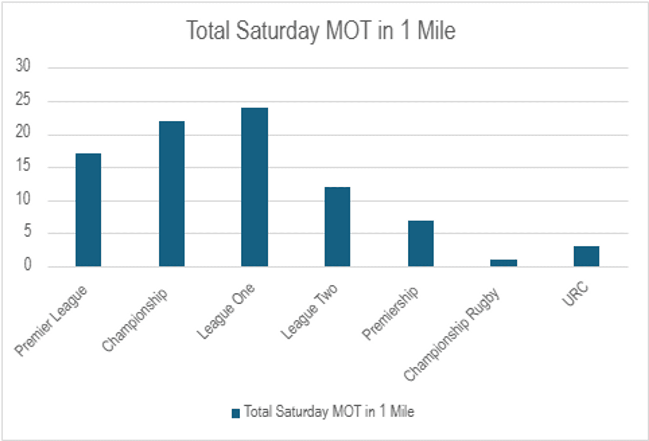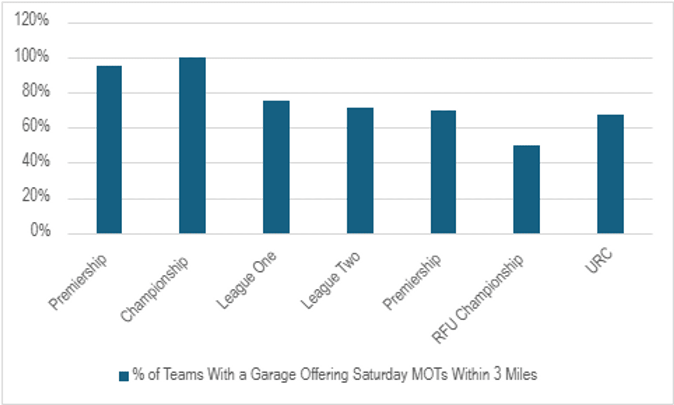 We entered the ground postcode of every team in the following leagues into BookMyGarage.com to find out how many local garages offer Saturday appointments to UK sports fans: