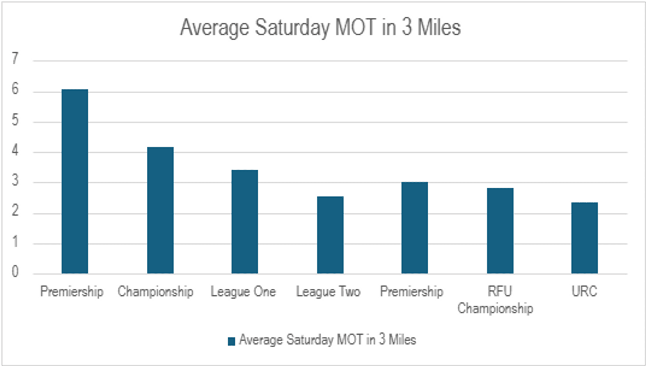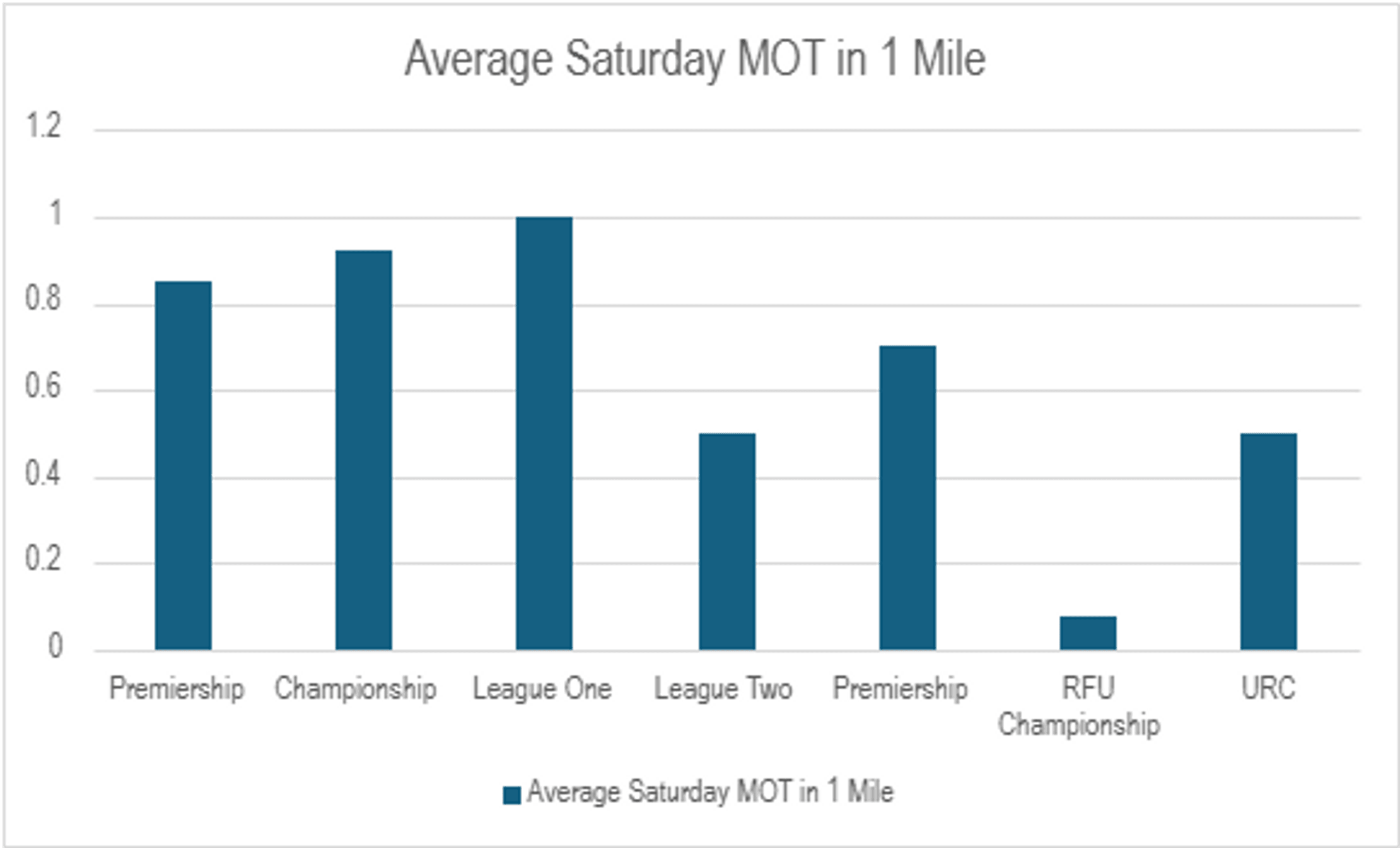 At the other end of the scale, there was only one garage offering Saturday MOT appointments within 1 mile of the 12 RFU Championship clubs – giving a league average of just 0.08 garages per club!