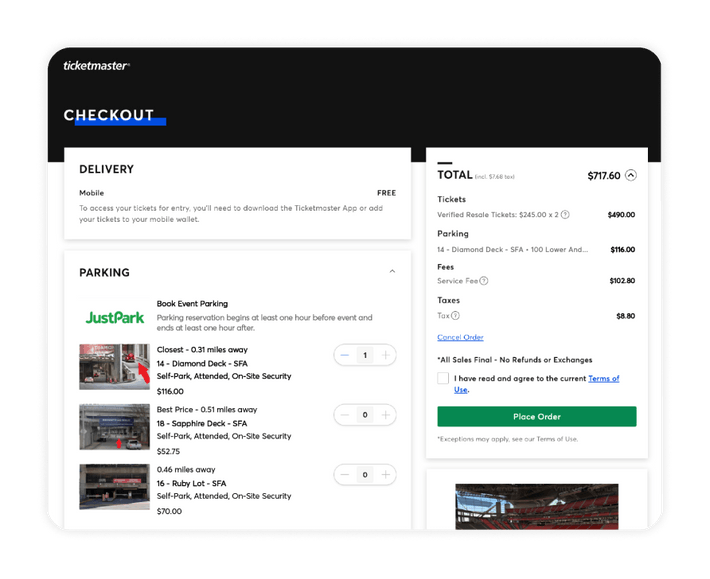 Sell event parking passes directly on your venue site and in the Ticketmaster checkout, with all inventory managed in the JustPark platform.